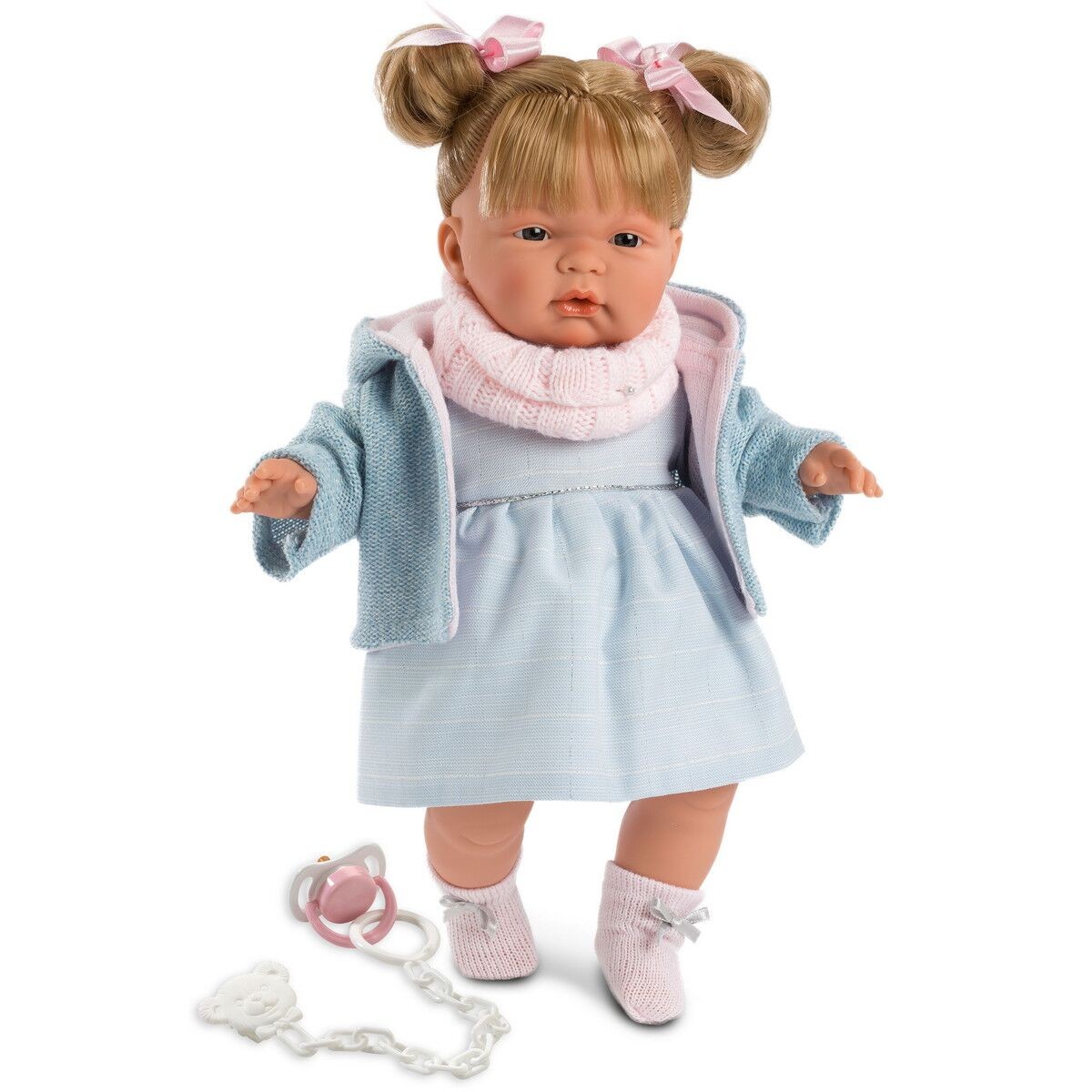 Hiszpańska lalka Joelle 38324 ma 38 cm i wykonana jest z delikatnego, przyjemnego w dotyku winylu. Jej miękki brzuszek wypełniony jest wyściółką. Po wyjęciu smoczka lalka zapłacze i powie "mama, papa". Joelle ma niebieskie oczy otwarte na stałe oraz półdługie, proste włosy z grzywką koloru blond. Włoski są związane w kucyczki różową tasiemką. Ubrana jest w doskonałej jakości niebieską sukienkę oraz niebiesko-różowy kaftanik z kapturkiem. W komplecie są także różowy komin otulający szyję oraz gustowne skarpetki z kokardką.