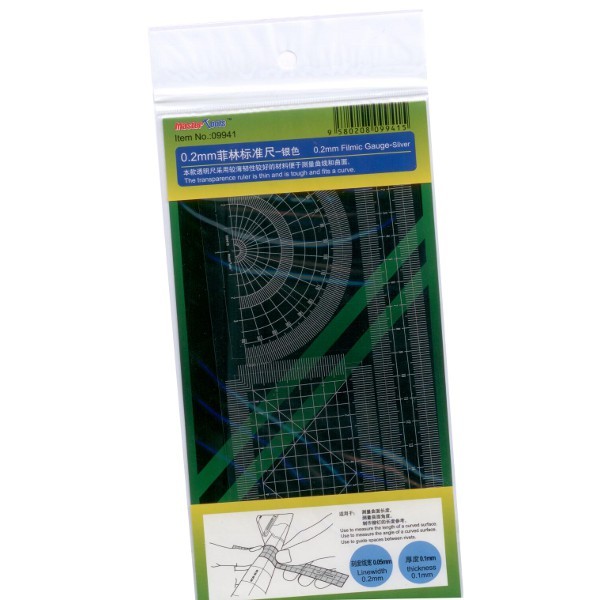 Zestaw przeźroczystych i giętkich przyrządów pomiarowch pozwalający pracować na zaokrąglonych powierzchniach. Szerokość linii - 0,2 mm. Grubość - 0,1 mm. Podziałki w kolorze srebrnym. W skład zestawu wchodzi linijka, kątomierz, prostokątny liniał pomiarowy.