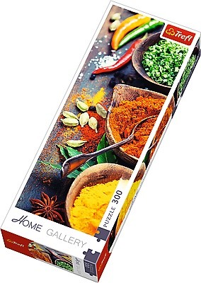 Puzzle 300 elementów przedstawiające kolorowe przyprawy. Po ułożeniu powstanie obrazek o wymiarach 16 x 48 cm. Wysoką jakość, nasycenie kolorów i bezpieczeństwo układania zapewnia kalandrowany papier odbijający światło, pokryty ekologicznymi farbami spożywczymi.