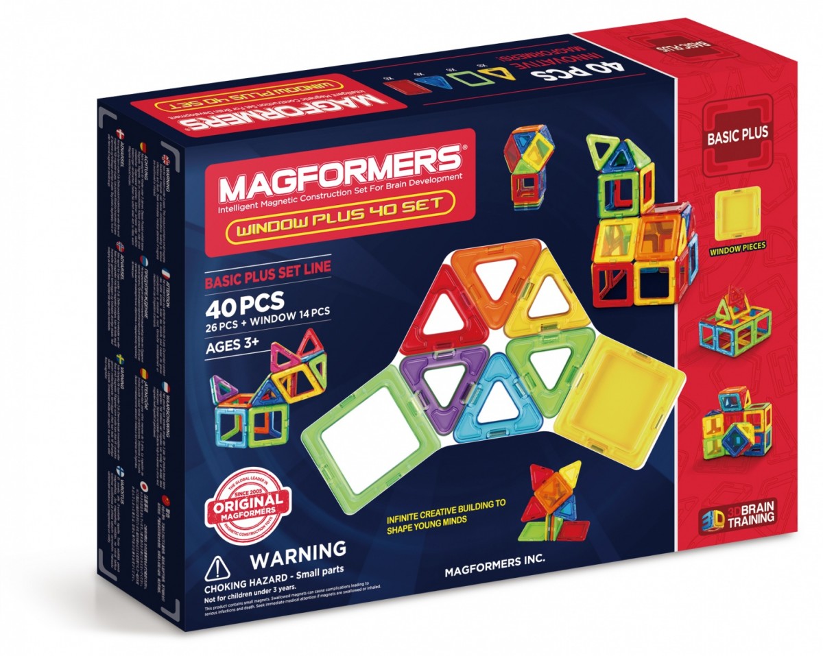 Magformers Educational Window Plus 40 set to zestaw zawierajacy zarówno klocki magnetyczne z wypełnionymi kształtami jak i standardowe elementy ( ramki ) oraz instrukcję pozwalajacą tworzyć wiele różnorodnych modeli.