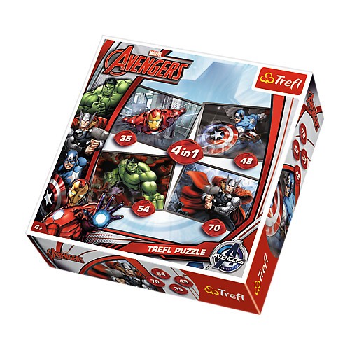 Nie jedna, nie dwie, ale aż cztery układanki zamknięte w jednym pudełku to prawdziwa gratka dla miłośników puzzli! Po ułożeniu otrzymamy cztery obrazki różnej wielkości z superbohaterami z drużyny Avengers: Thorem, Iron-Manem, Kapitanem Ameryką i Hulkiem. Zestaw doskonale spełnia oczekiwania rodzeństwa - każdy ułoży swój ulubiony obrazek nawet w tym samym czasie. Zróżnicowana liczba elementów pozwala na zabawę zarówno młodszym, jak i nieco starszym dzieciom. Dodatkowym urozmaiceniem zabawy może być układanie na czas, porównywanie obrazków, szukanie różnic i podobieństw.