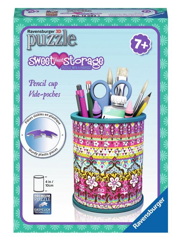 Zestaw puzzli, który spodoba się każdej dziewczynce. Dzięki niemu stworzy swój własny przybornik na ołówki, kredki i inne szkolne akcesoria. Puzzle zostały wykonane w technologii Easy-Click, dzięki której wszystkie elementy idealnie do siebie pasują.