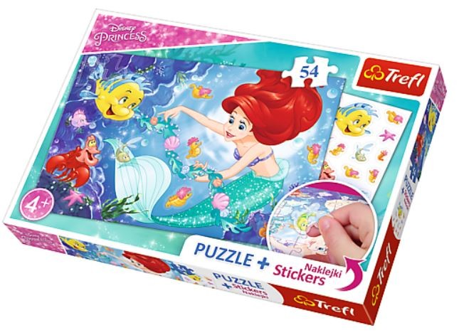 54 ElementyPuzzle + naklejki Arielka wśród rybek