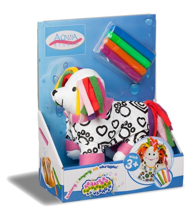 Zestawy AQUA STUDIO pozwalają na zabawę w… wannie! Dzięki specjalnym flamastrom i maskotkom zwykła kąpiel nabiera kolorów. Dosłownie i w przenośni. W skład tego zestawu wchodzi piesek-maskotka i 4 zmywalne flamastry. Na łebku pieska znajdują się kolorowe paseczki. Podobne ozdoby tworzą jego ogon. Na tułowiu pieska widnieją serduszka i odciśnięte łapki. Wewnątrz zwierzątka znajduje się gąbka, można więc bez obawy wkładać je do wody. Ale to nie koniec atrakcji. Pieska można pomalować za pomocą dołączonych do zestawu zmywalnych flamastrów, o intensywnych kolorach! Kolorować, tworzyć własne rysunki. Gdy jakiś wzór nam się znudzi, możemy go zmyć i zacząć zabawę od początku!