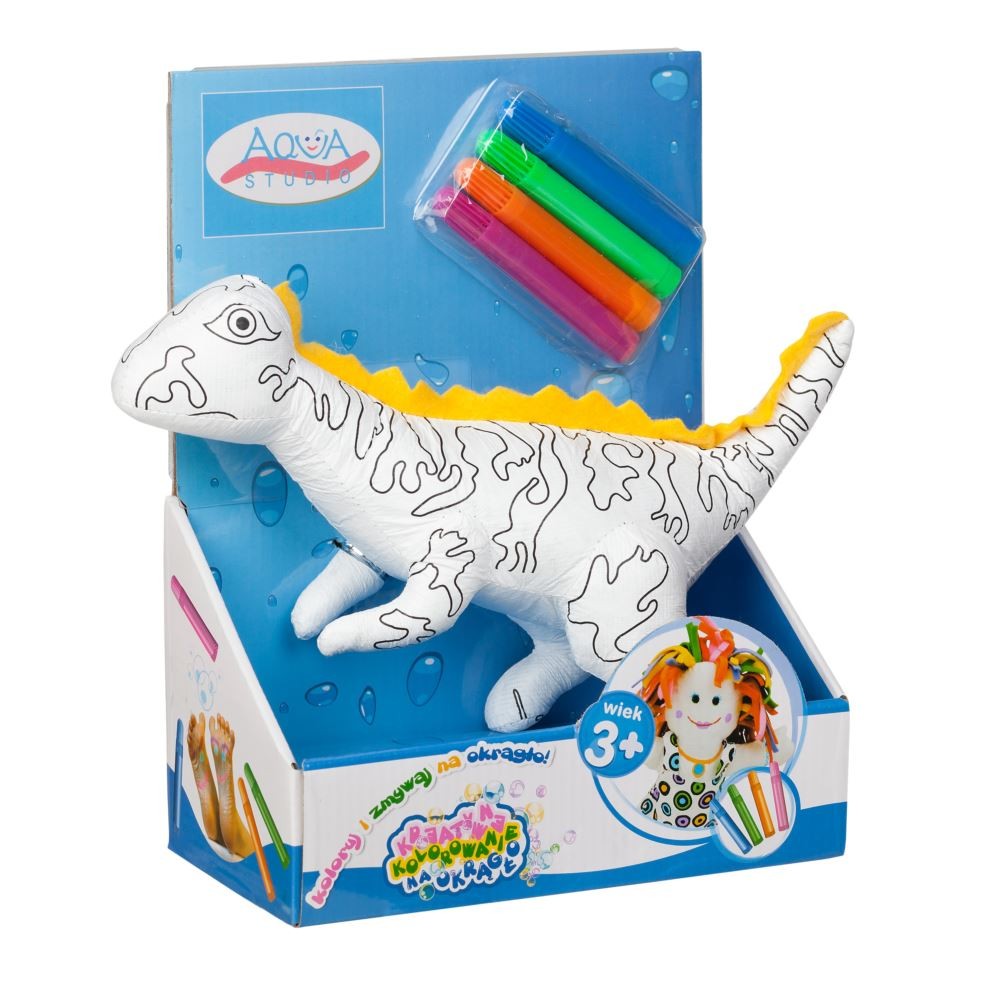 W skład tego zestawu wchodzi maskotka - dinozaur triceratops i 4 zmywalne flamastry. Tułów, łebek, nogi i ogon dinozaura ozdobione są różnymi wzorami: szlaczkami i kółeczkami.
