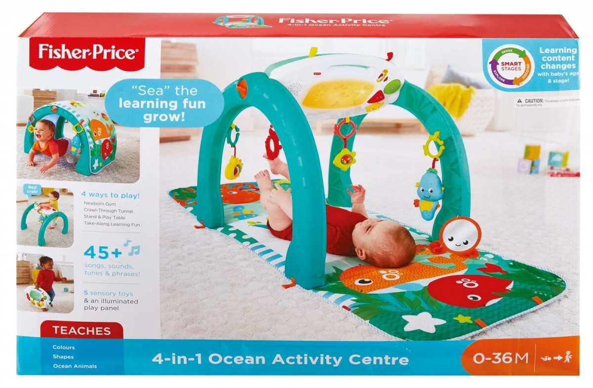 Twoje dziecko będzie przeżywać rozmaite morskie przygody podczas zabawy tą ulegającą transformacji matą gimnastyczną 4 w 1! Gruba kolorowa mata do zabawy, przyczepiane i stymulujące zmysły zabawki oraz podświetlany panel aktywności odtwarzający wesołe piosenki, dźwięki, melodie i wypowiedzi to wszystko sprawia, że oceaniczne centrum aktywności zapewni Twojemu małemu odkrywcy całe mnóstwo edukacyjnej zabawy przez pierwszych kilka lat życia! Całe mnóstwo wyrazistych kolorów, rozmaite faktury, światełka i dźwięki angażują oraz stymulują rozwijające się zmysły dziecka. Dziecko ćwiczy mięśnie i rozwija sprawność ruchową podczas interakcji z matą i zabawkami. Mali podwodni odkrywcy uczą się związków przyczynowo-skutkowych, kiedy odkrywają, że naciskanie przycisków na panelu aktywności uruchamia wesołe piosenki, dźwięki, melodie i wypowiedzi!