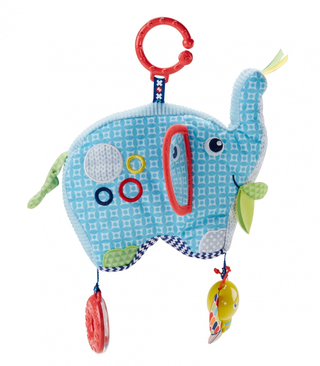 Duży, miękki słonik będzie niezapomnianym przyjacielem i pierwszym towarzyszem zabaw Twojego maluszka, zapewniając mu mnóstwo doznań dotykowych dzięki użyciu sztruksu, dzianiny, pluszu i szeleszczących materiałów. Kryje się w nim wiele niespodzianek, jak lusterko w uchu lub dźwięki dzwoneczka wydobywające się przy potrząśnięciu lub trąceniu. Do nóg słonika przyczepione są grzechotka i kolorowy motylek. Wychodząc na spacer, możesz przyczepić słonika do torby lub wózka, żeby cały czas zabawiał Twoje dziecko!