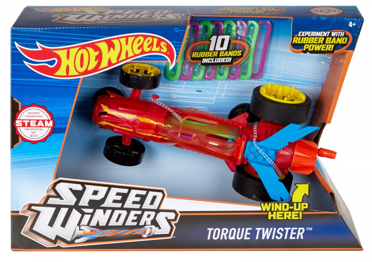 Na początek zamocuj gumki, aby przygotować napęd swojego autonakręciaka. Im mocniej naprężysz wewnętrzną gumkę, tym więcej mocy zapewnisz swojemu pojazdowi! Do nakręcanej wyścigówki dołączono rozmaite gumki, z którymi możesz eksperymentować. Nakręcaj je mocniej lub słabiej, kontrolując prędkość swojego pojazdu. Odkrywaj nowe możliwości, korzystając z rozmaitych rodzajów gumek! Pojazdy napędzane gumkami wprowadzają do świata Hot Wheels® elementy nauki, techniki, inżynierii, sztuki i matematyki, ucząc w czasie zabawy kreatywnego myślenia i umiejętności rozwiązywania problemów. Pojazdy można ze sobą łączyć, aby podwoić ich prędkość!