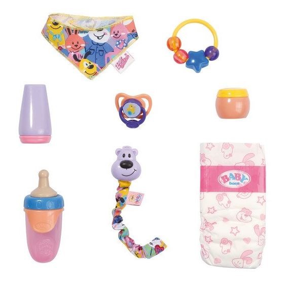 Właściwa opieka nad dzieckiem wymaga wielu akcesoriów. Najważniejsze to butelka do karmienia i oczywiście pielucha. Aby zmienić pieluchę, potrzebujesz specjalnego pudru - zasypki, a w przypadku podrażnienia - tubki kremu. Kiedy mała BABY born marudzi albo płacze z łatwością uspokoisz ją smoczkiem na łańcuszku, ozdobionym klipsem z Niedźwiadkiem. Zdarza się Wam być poza domem w chłodne lub wietrzne dni? Kolorowa apaszka ogrzeje ją i nie pozwoli się przeziębić. Dodatkowo w zestawie znajduje się gryzak ozdobiony uroczymi gwiazdkami i koralikami.
