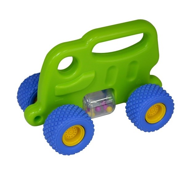 Ciekawa i bezpieczna zabawka dla najmłodszych "BABY GRIPCAR" - "CIĘŻARÓWKA" od firmy POLESIE. Niewielki pojazd ma kształt ciężarówki. Wyposażony jest w cztery gumowe kółka o chropowatej strukturze. Dzięki temu ciężarówka nie robi dużego hałasu, a dziecko z łatwością może nim poruszać po różnego rodzaju podłożu. Między przednimi, a tylnimi kołami umieszczono pojemnik w kształcie walca. Podczas poruszania pojazdem kolorowe kuleczki umieszczone w środku przyjemnie grzechoczą. Istnieje możliwość przywiązania sznurka do ciężarówki, co umożliwi jego ciągnięcie.
