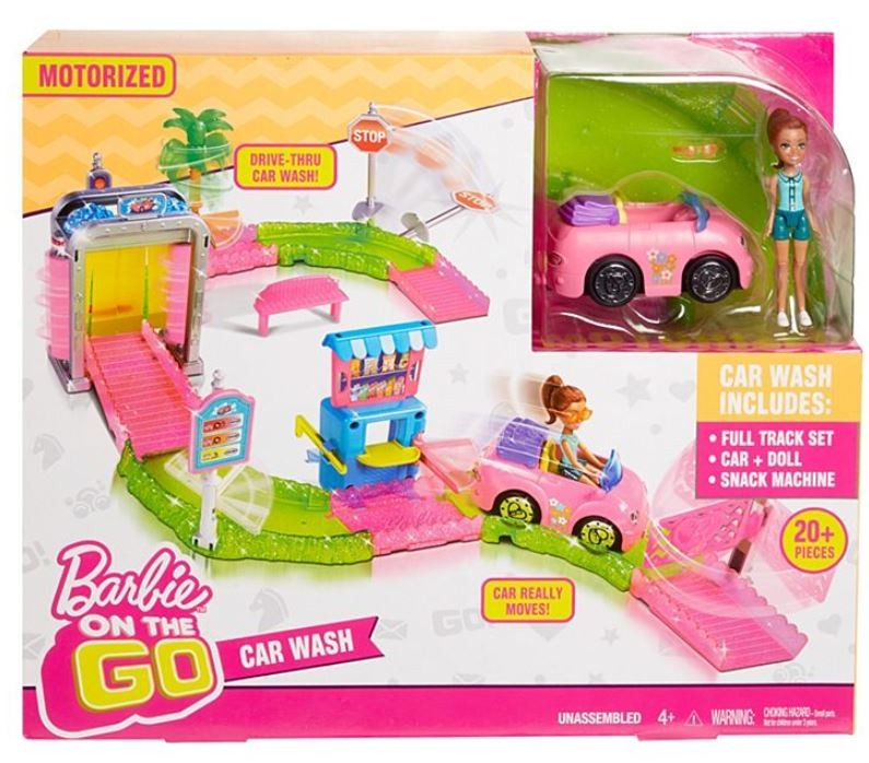 Zestaw torów Barbie On The Go Myjnia samochodowa zawiera wszystkie elementy, jakich potrzebujesz, by puścić hamulce wyobraźni! Znajdziesz tu napędzany kabriolet (zasilanie na baterię pozwala na samodzielną jazdę), a także 10 części toru (które można dowolnie zestawiać) i akcesoria reagujące na dziewięć zaskakujących sposobów, kiedy Barbie mija je swoim samochodem.