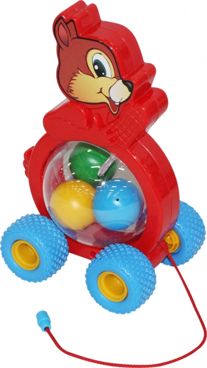 BIMBOSFERA - WIEWIÓRKA wyposażony jest w gumowe koła. Dzięki nim pojazd zachowuje stabilność podczas jazdy i z łatwością pokonuje nierówne podłoże. Na wysokości brzucha naszej wiewiórki umieszczona jest przezroczysta kula. W jej środku natomiast mniejsze, kolorowe piłeczki. Wszystko zaczyna się obracać w momencie, kiedy zabawkę wprawimy w ruch.