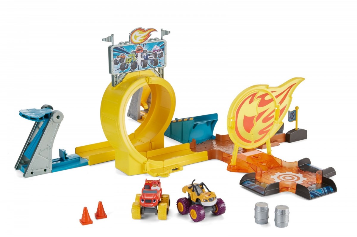 Przygotuj się na ogromne emocje z tym kaskaderskim zestawem torów do zabawy! Umieść swoje ulubione pojazdy w lini Blaze i Megamaszyny na dwóch wyrzutniach i uderz mocno by jes wystrzelić. Jedna wyrzutnia wyśle pojazd, by przebił się przez znak Blaze'a i wbił w pachołki drogowe. Druga zaś pomaga megamaszynie nabrac prędkości i pokonać grawitację na pętli a następnie uderzyć w ustawione beczki.