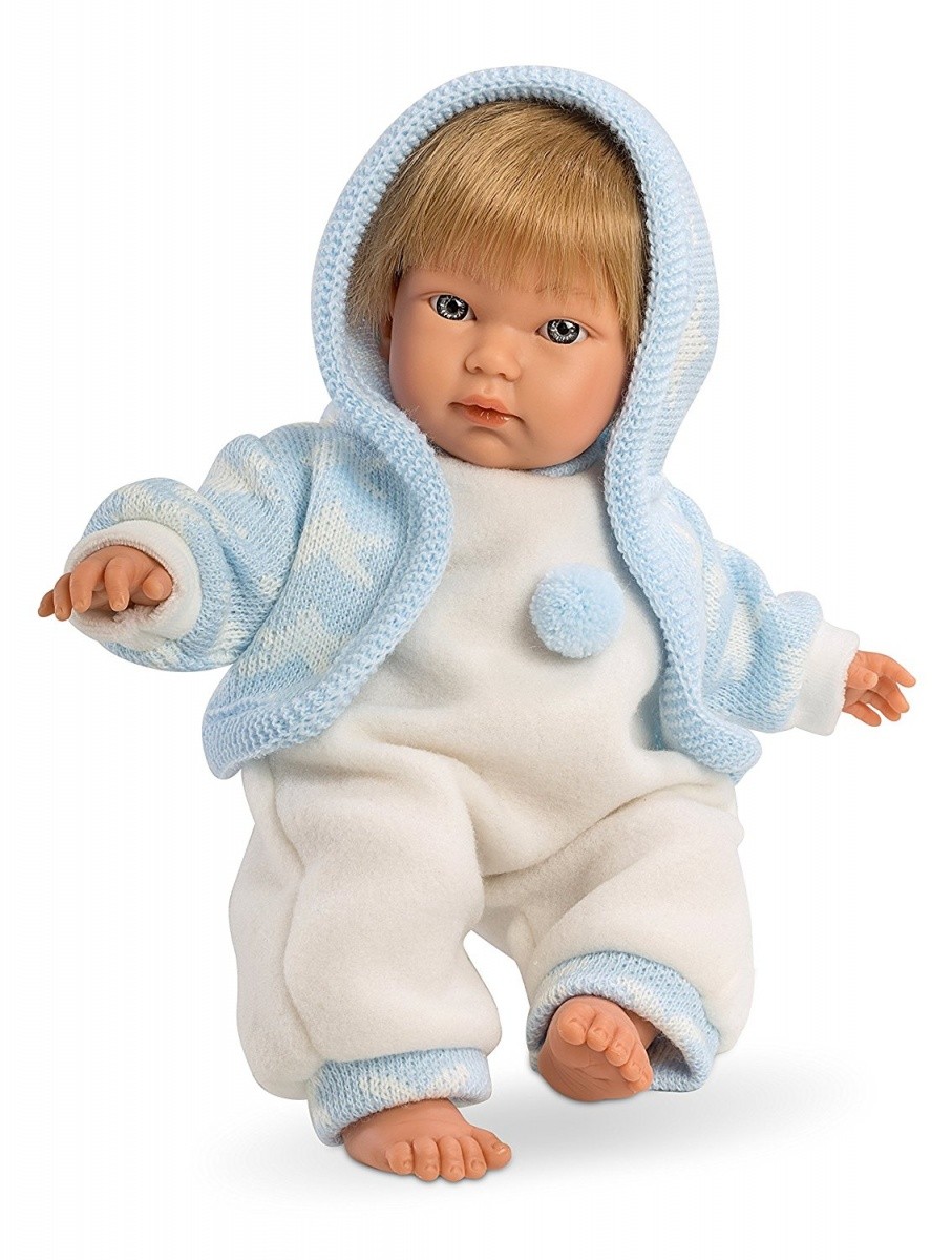 Bobas ubrany jest w białą piżamkę z niebieskimi elementami oraz pomponem, niebieską narzutę w gwiazdki z kapturem.
