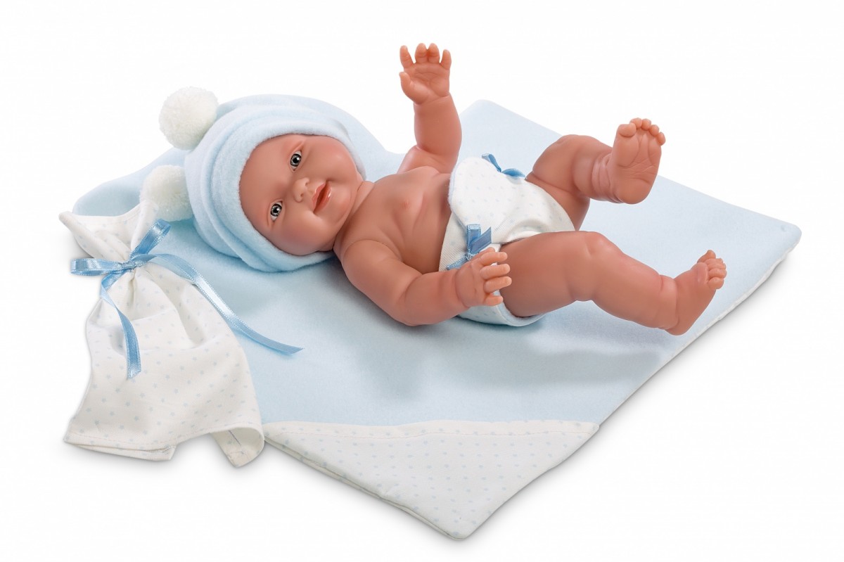 Każda mała dziewczynka będzie zachwycona lalkami firmy Llorens z uwagi na dbałość o szczegóły oraz wysoką jakoś wykonania. Lalka posiada budowę anatomiczną chłopca, w całości jest wykonana z przyjemnego w dotyku winylu, natomiast ubranka zostały uszyte z wysokiej jakości materiałów. Kończyny oraz głowa poruszają się wokół własnej osi, a oczy są na stałe otwarte. Główkę naszej lali zdobi niebieska czapeczka z pomponami. Niemowlę ubrane jest w niebiesko-białą pieluszkę z kokardkami. Do lalki dołączony smoczek, który pełni funkcję dekoracyjną, a także mięciutki, niebieski kocyk z kapturkiem oraz biała chustka.