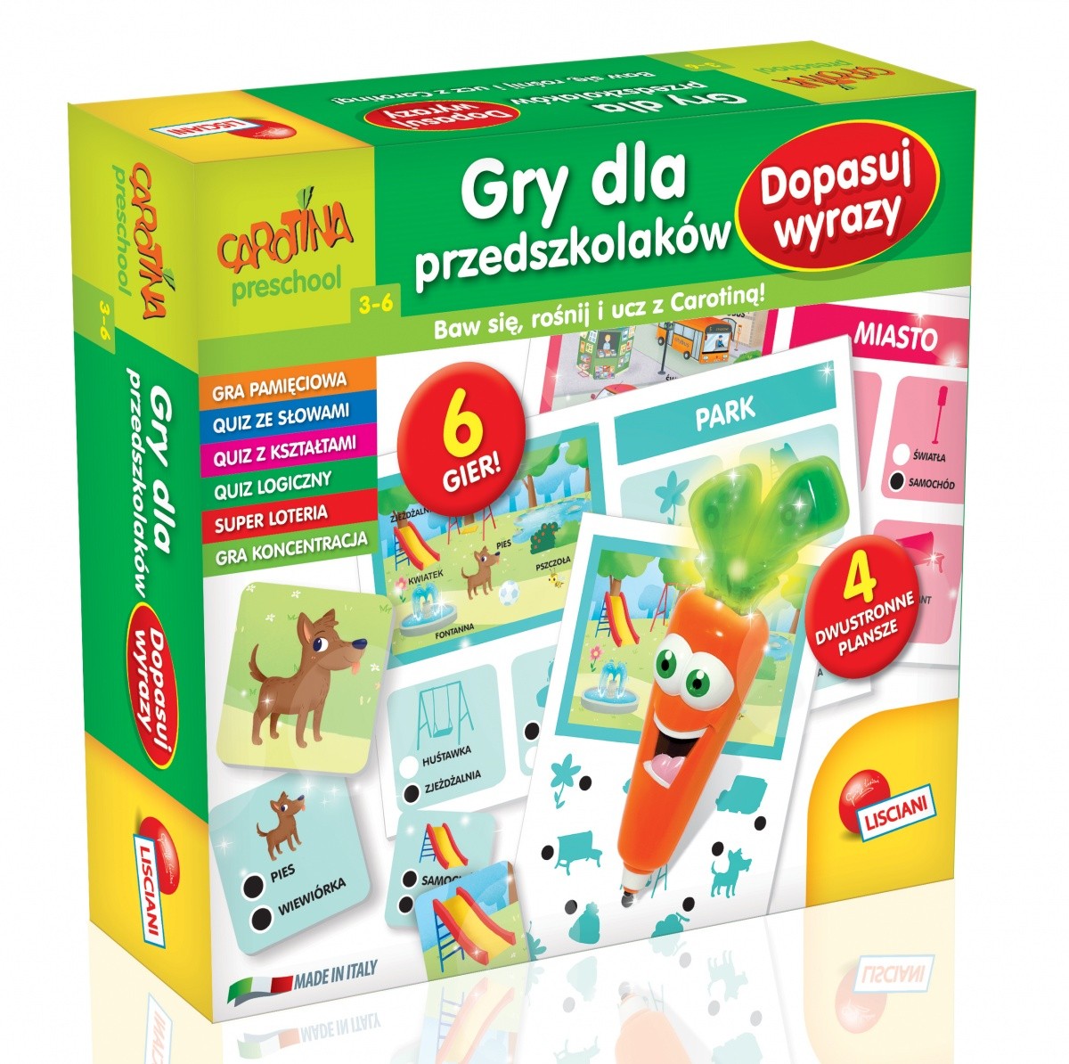 Zestaw 48 interaktywnych kart oraz 4 plansz przedstawiających słownictwo tematyczne od parku po góry, od miasta po rynek. Dzieci starają się odgadnąć prawidłową odpowiedź na zadane pytanie naciskając Carotiną na odpowiednią nazwę na karcie. Jeśli wybór jest prawidłowy Carotina zaświeci się i zagra wesołą melodię. Produkt umożliwia zabawę w 6 grach.