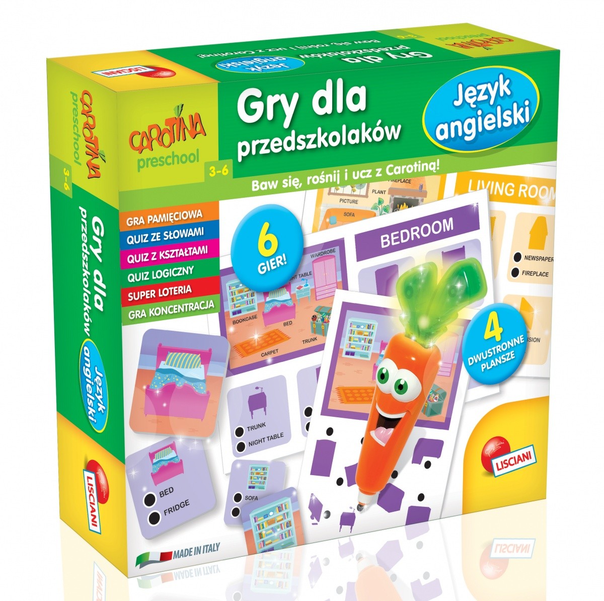 Zestaw 48 interaktywnych kart oraz 4 plansz do nauki języka angielskiego. Dzieci starają się odgadnąć prawidłową odpowiedź na zadane pytanie naciskając Carotiną na odpowiednią nazwę na karcie. Jeśli wybór jest prawidłowy Carotina zaświeci się i zagra wesołą melodię. Produkt umożliwia zabawę w 6 grach.