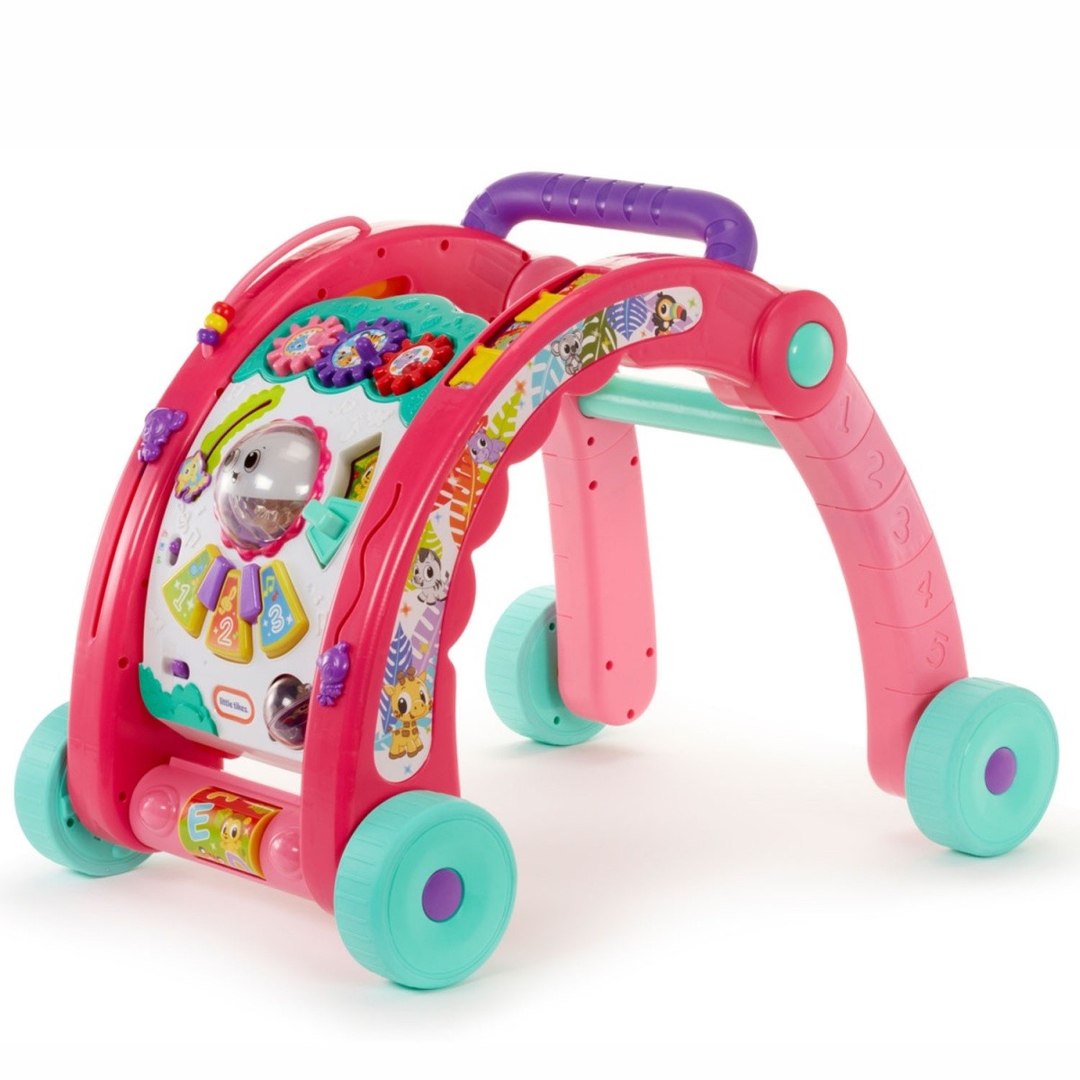Chodzik zawiera małe lusterko, mini fortepian, liczydło czy wygrawerowane na boku liczby a także przycisk uruchamiający zabawne melodykji i piosenki po polsku.