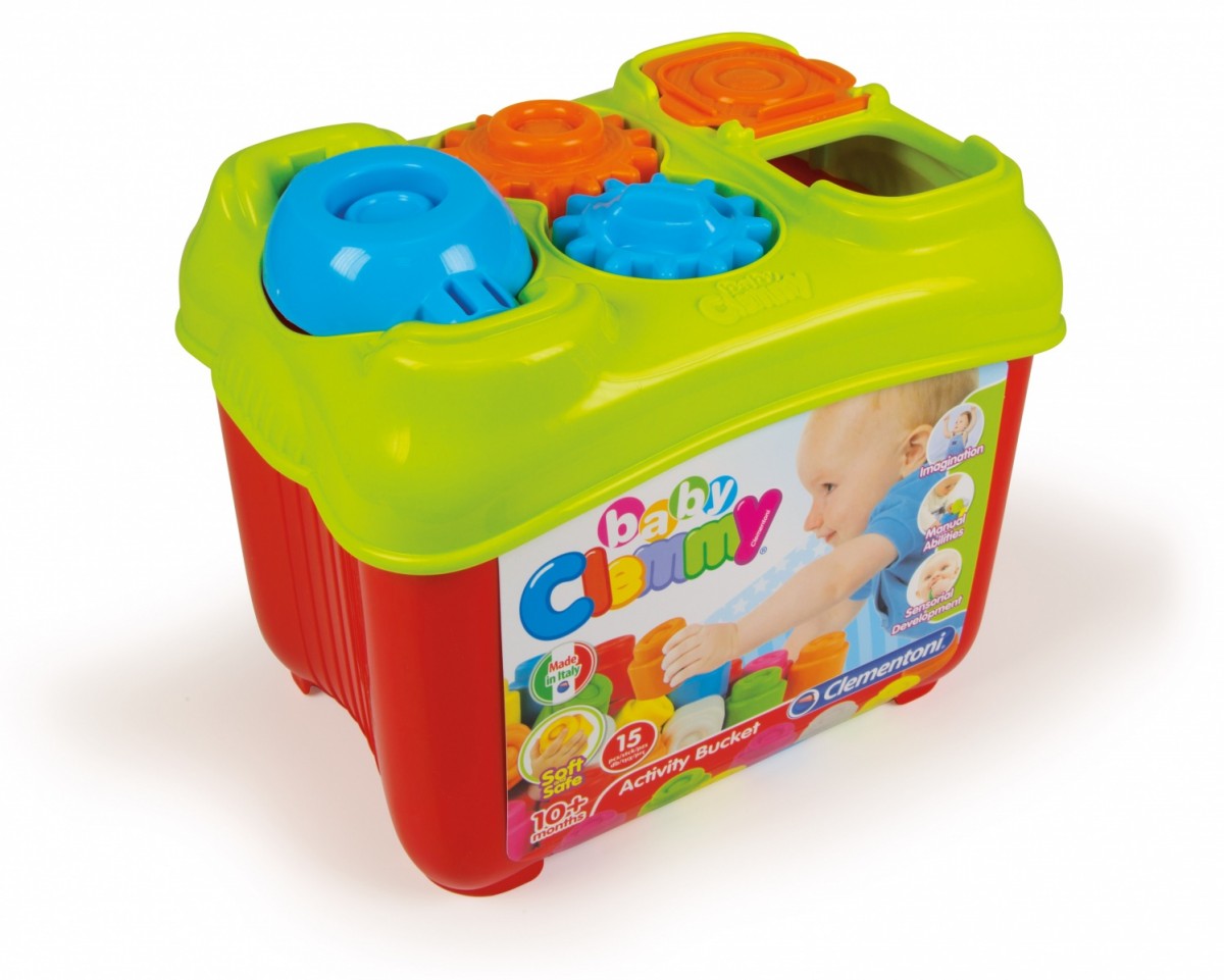 Super kolorowe wiaderko z 15 klockami Clemmy i zabawną przykrywką z dużą ilością działań mechanicznych zaprojektowanych specjalnie dla małych dzieci!