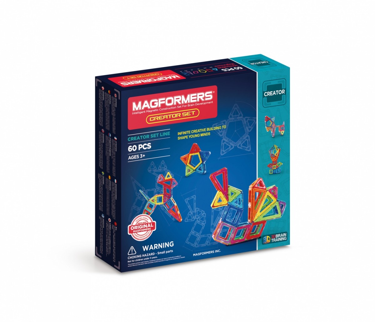 MAGFORMERS CREATOR 60 to klocki z wbudowanymi silnymi magnesami neodymowymi, które zawsze się przyciągają. Wystarczy zbliżyć do siebie ściankami dwa klocki, a one natychmiast ze sobą się połączą. Za pomocą klocków wzorowanych na kształt figur geometrycznych można zbudować wspaniałe trójwymiarowe budowle. W zabawie można korzystać z dołączonej do zestawu instrukcji lub innych przykładów zamieszczonych na stronie magformersworld.com lub własnej wyobraźni.