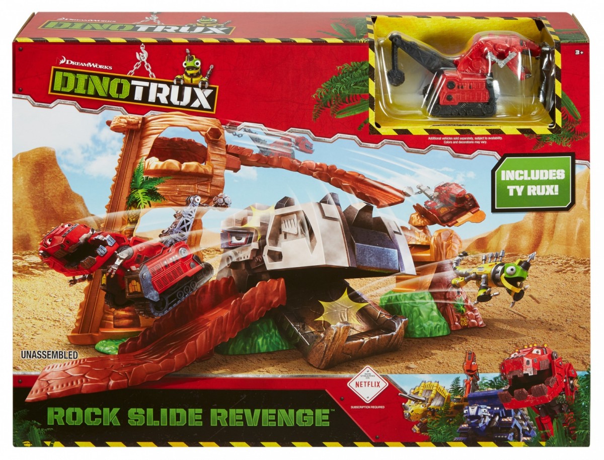 Przygotuj się na starcie ze złowieszczym D-Struxem i odgrywaj sceny z serialu Dinotrux! Zestaw do zabawy Dinotrux Przygoda w kanionie posiada specjalną windę, która pozwala wywozić swojego bohatera na punkt obserwacyjny znajdujący się na samym szczycie kanionu. Zjeżdżaj Ty Ruxem na sam dół po „skalistej” zjeżdżalni wijącej się wokół zestawu. Ale uważaj, bo jadąc po zjeżdżalni, możesz trafić prosto do paszczy łakomego D-Struxa, która otwiera się i zamyka bez ostrzeżenia! Zestaw zawiera Ty Ruxa oraz specjalne miejsca do zawieszenia Repgadów (nie znajdują się w zestawie). Łączy się z innymi zestawami do zabawy Dinotrux. Ty Rux znajduje się w zestawie.