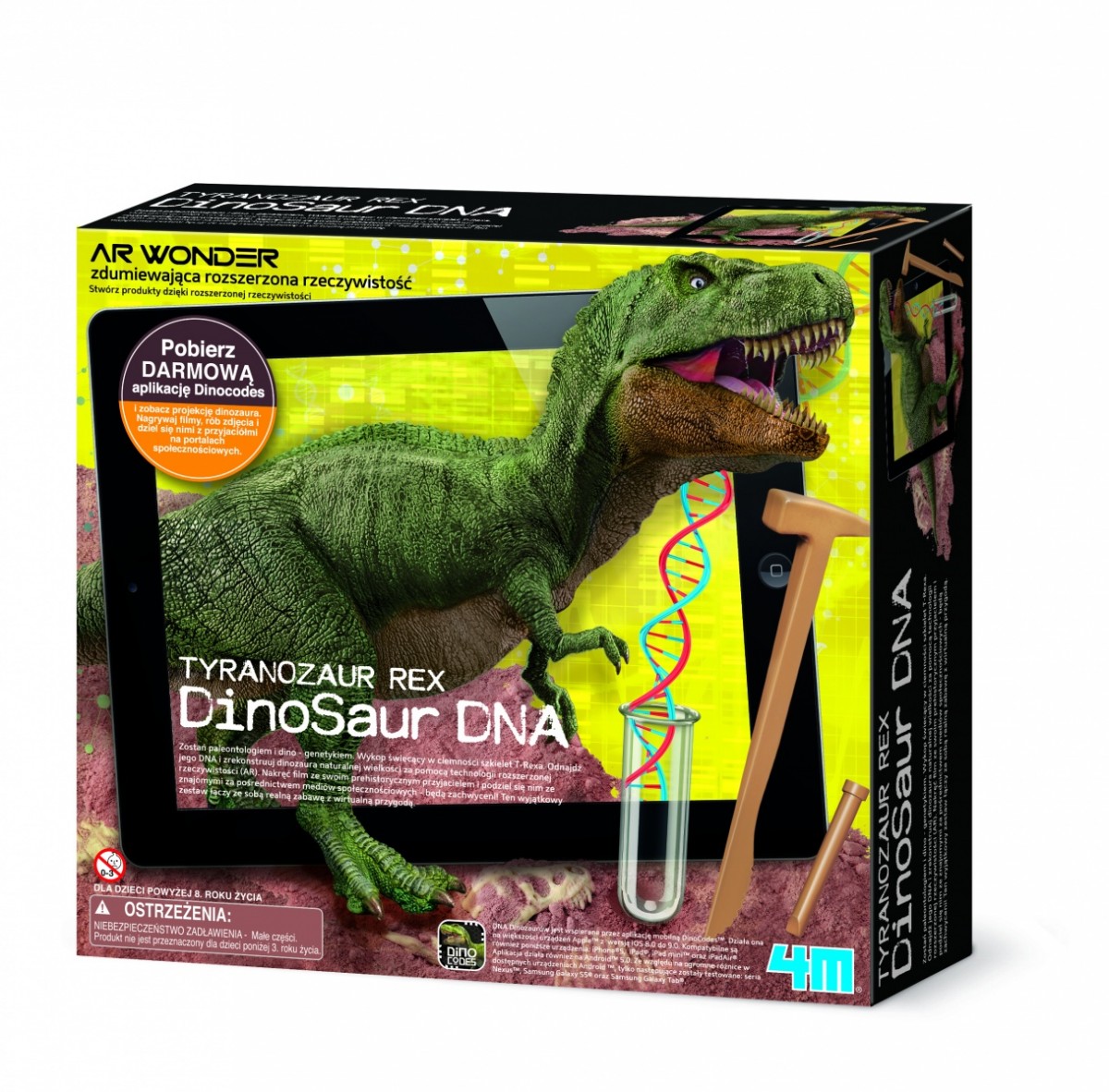 Wykop świecący w ciemności szkielet T-Rexa. Odnajdź jego DNA i zrekonstruuj dinozaura naturalnej wielkości za pomocą technologii rozszerzonej rzeczywistości (AR). Nakręć film ze swoim prehistorycznym przyjacielem i podziel się nim ze znajomymi za pośrednictwem mediów społecznościowych - będą zachwyceni! Ten wyjątkowy zestaw łączy ze sobą realną zabawę z wirtualną przygodą.
