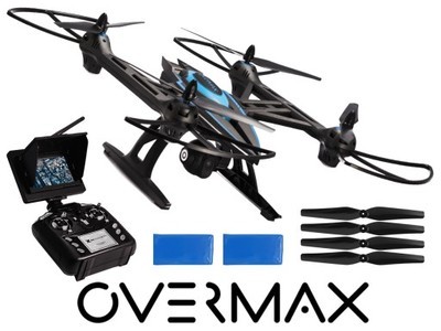 W zestawie z kamerą znajduje się pilot, kamera z obudową, pilot z uchwytem FPV, karta SD 4GB oraz 4 zapasowe śmigła.
