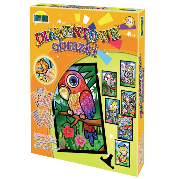 Zestaw składa się z sześciu kolorowych obrazków, które należy uzupełnić mieniącymi się naklejkami. Miejsca na naklejki oznaczone są kształtem i numerem, tak aby najmłodsze dzieci nie miały ułatwione zadanie. Tak wykonane mozaikowe obrazki można postawić w pokoju na półce w eksponowanym miejscu jako własnoręcznie wykonana ozdoba dzięki dołączonym podstawką. Dzieci mogą obrazki wykorzystać jako laurki w prezencie dla bliskiej osoby. Zabawa kolorowymi, błyszczącymi naklejkami w kształcie przestrzennych diamentów spodoba się wszystkim dzieciom lubiącym prace ręczne.