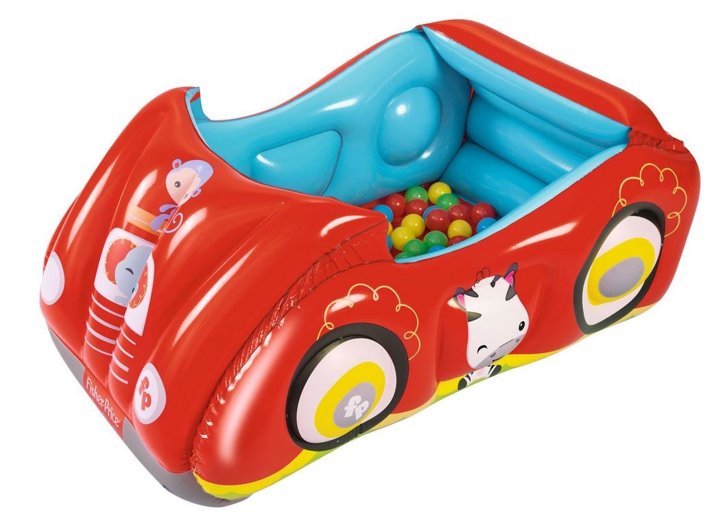 Kolorowy dmuchany samochód na licencji Fisher Price to produkcja firmy Bestway. Kolorowy plac zabaw w postaci samcochodu z 25 kolorowymi piłeczkami sprawdzi się podczas zabawy w domu, a także na zewnątrz. Namiot wykonany jest z wytrzymałego winylu. Grafika namiotu jest bardzo efektowna, zapewni mnóstwo pozytywnej energii podczas zabawy. Bajecznie kolorowy, dmuchany plac zabaw od Bestway przeznaczony dla dzieci od 2 roku życia. Na placu zabaw można bawić się na sucho.