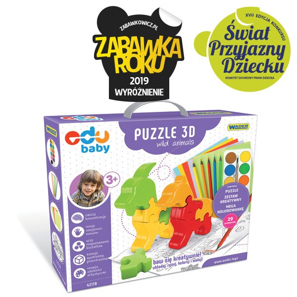 Świat zwierząt zaprasza maluchy do świetnej zabawy! Czas podążyć za lisem do jego kryjówki oraz poznać fascynujące ścieżki kozicy górskiej! Układamy, rysujemy, kolorujemy czy malujemy? Wszystkie te aktywności można realizować dzięki kreatywnemu zestawowi Puzzle 3D- Wild Animals!