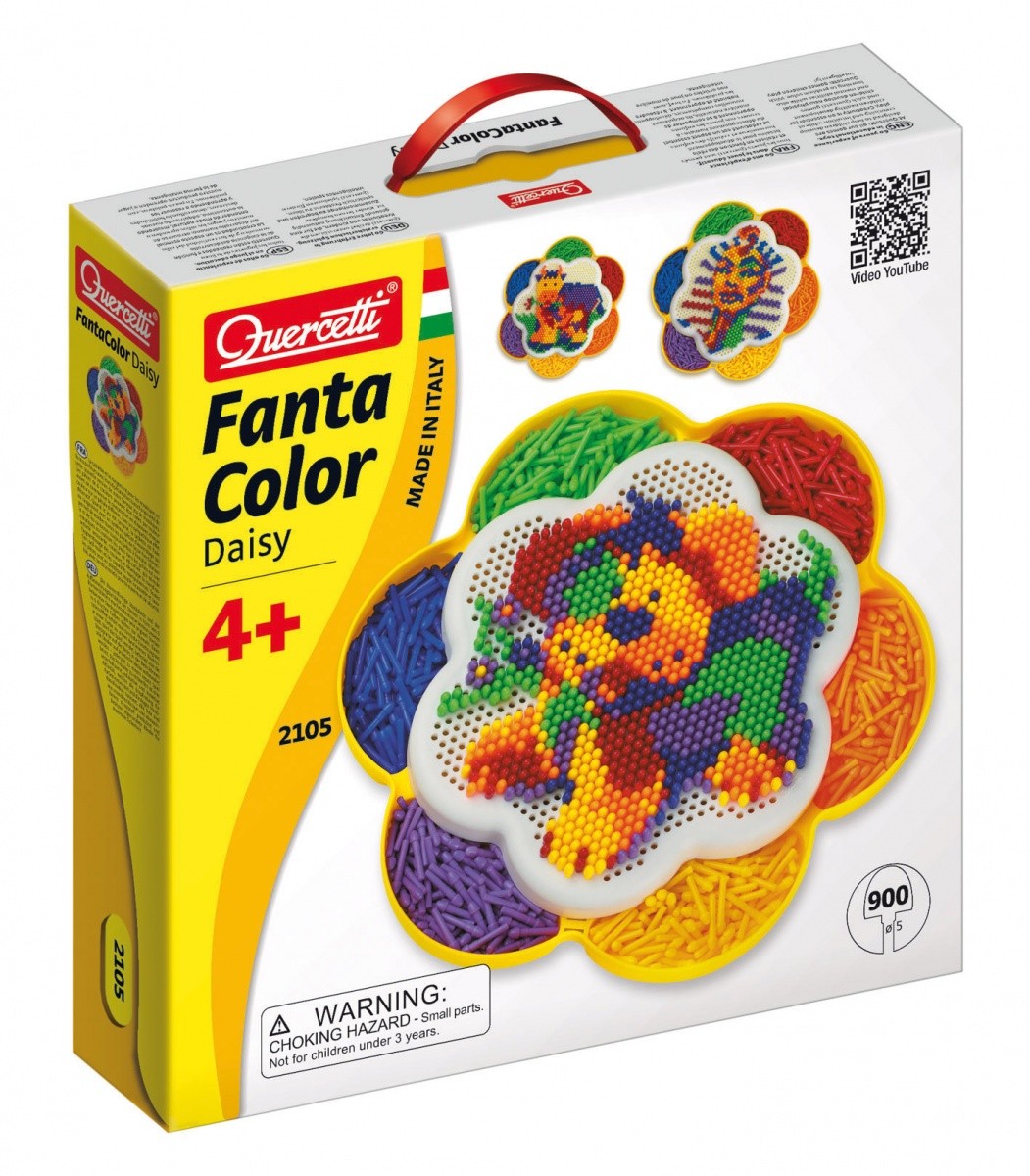 Zabawka stymuluje rozpoznawanie kolorów, rozwija umiejętności manualne oraz koordynację ruchową. Zestaw składa się z 900 kołeczków o średnicy 5 mm, instrukcji oraz sortera w kształcie koniczynki, który spełnia rolę przechowywania, pudełeczek dla kołeczków pod czas układania jak i podstawki do szablonu.