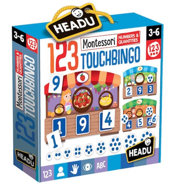 Zagraj w bingo na malutkim ryneczku. Dzięki wyczuwalnej strukturze cyfr i kropek od 1 do 9 dzieci mogą kompletować swoje karty z numerami i ilościami, co nauczy ich pierwszych obliczeń.