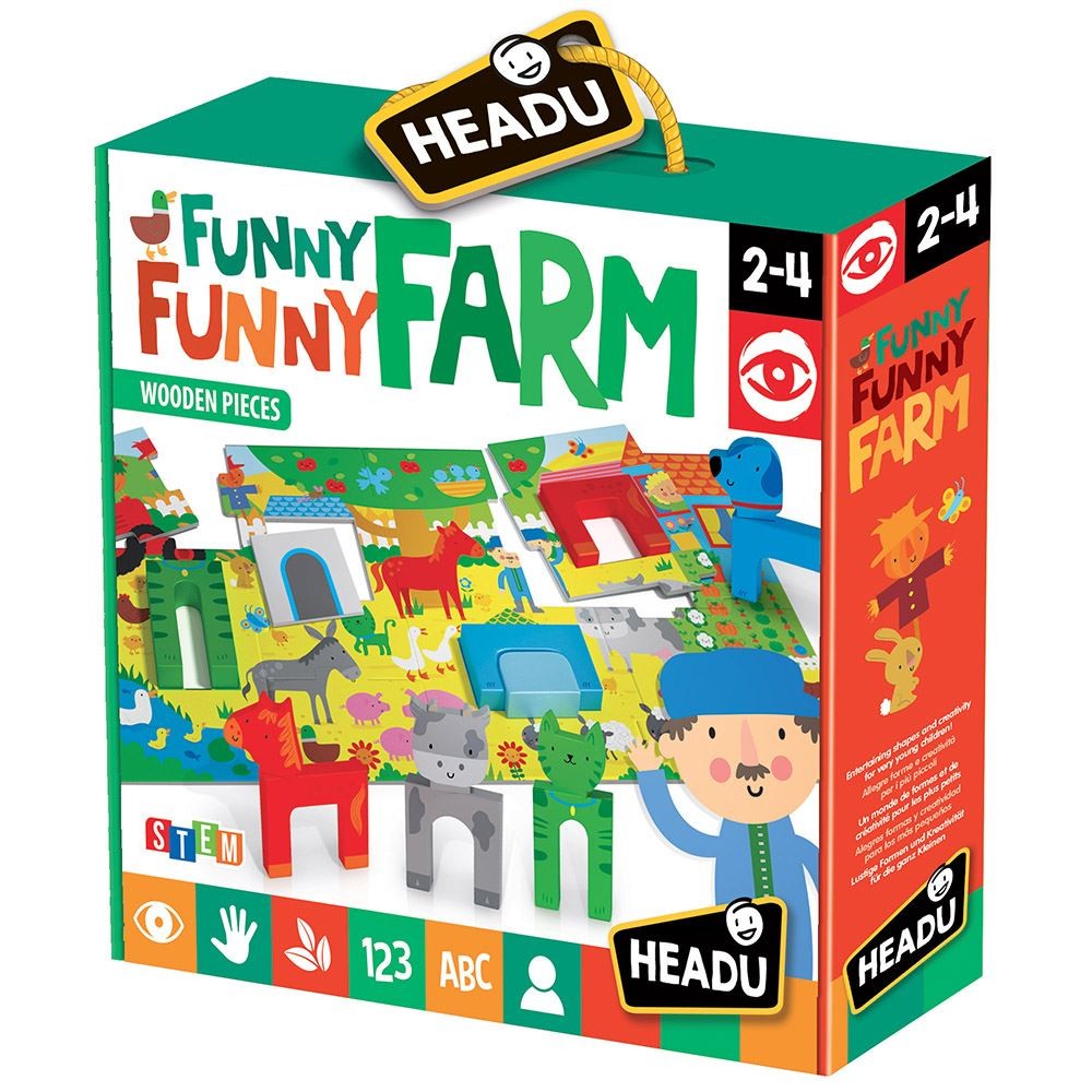 Zabawna, zabawna farma to zestaw samokorygujących puzzli przedstawiających kolorową farmę. W komplecie są także figurki zwierząt, które można dopasować do układanki. Każde zwierzę można układać niemal dowolnie - co szalenie pobudza wyobraźnię najmłodszych!