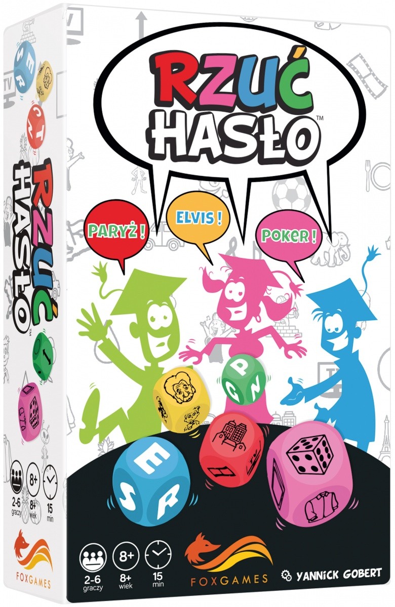 Rzuć Hasło zawiera różnokolorowe kości z literami i tematami. Gra polega na znajdowaniu skojarzeń do tematów, a słowo musi rozpoczynać się na konkretną literę. Gracze muszą jednak uważać, aby nie połączyć ze sobą dwóch kości w tym samym kolorze. Gimnastyka mózgu gwarantowana!