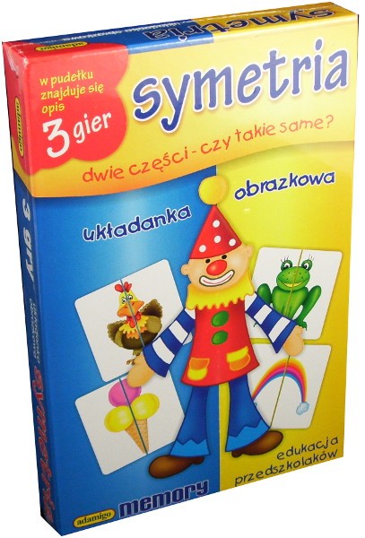 Gdyby tak przepołowić jabłko i dołożyć je przekrojoną częśćią do lustra, zobaczysz całe jabłko. Z grzybem byłoby tak samo i jeszcze z wieloma innymi przedmiotami, które jednak trudno byłoby przekroić... Nie radzimy Ci robuć takich doświadczeń ze słoikiem, butelką czy misiem. Ta cecha niektórych przedmiotów, postaci i zwierząt nazwya się symetrią. dzieje się tak dlatego, że te przedmioty, które są symetryczne, mają jednakową lewą i prawą stronę, ale jakby odbitą w lustrze. W środku pudełka znajduje się układanka i opis trzech ciekawych gier, które pozwolą utrwalić Ci pojęcie symetrii. Gra przeznaczona: dla 1 do 6 osób w wieku powyżej 5 lat