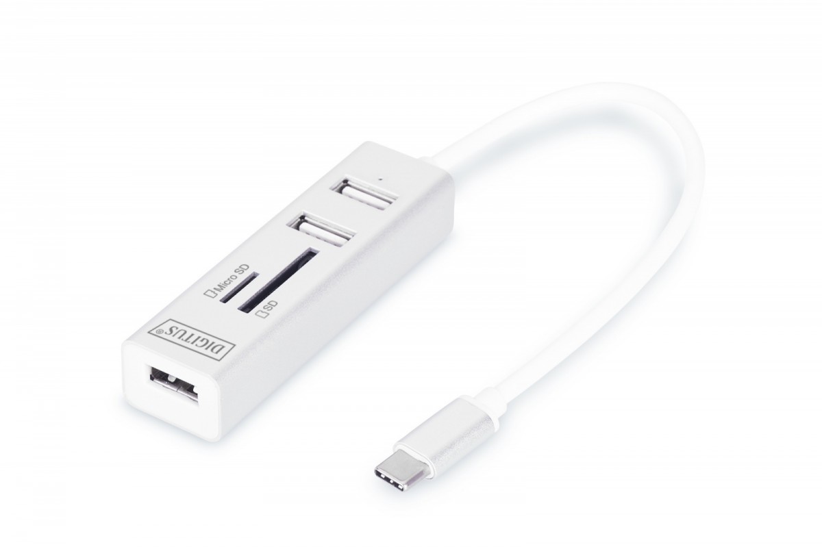 HUB/Koncentrator 3-portowy OTG USB Typ C, USB 2.0 HighSpeed czytnik kart SD/Micro SD, aluminium