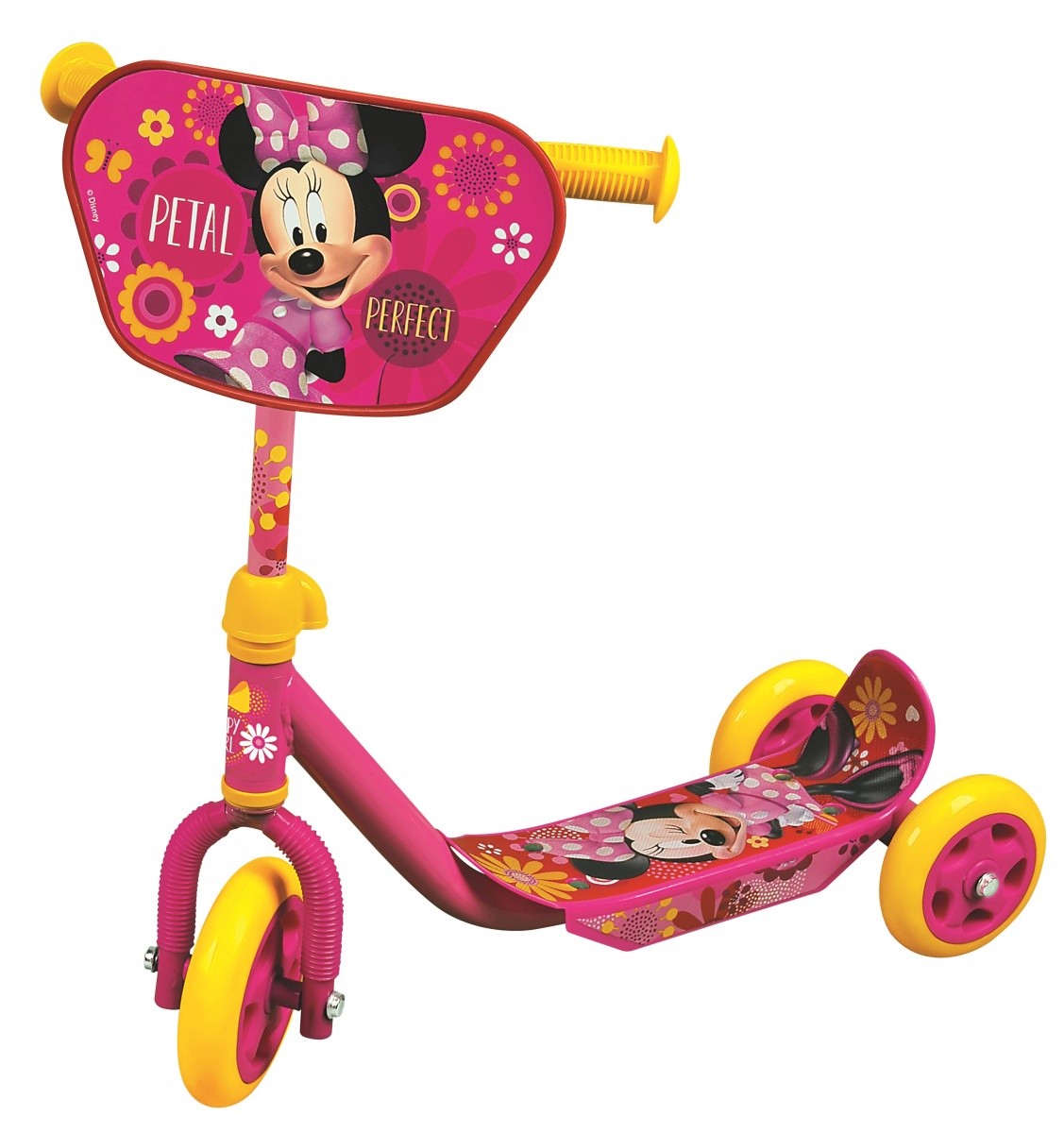 Metalowa hulajnoga trójkołowa z wizerunkiem bohaterów Disneya Myszki Minnie.