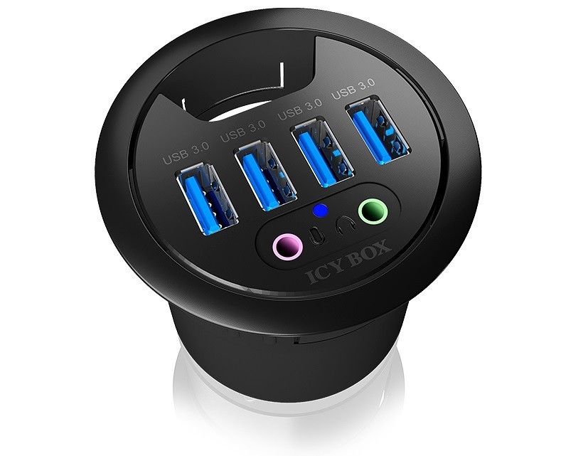 IB-HUB1403a montowany jest w otworze w Twoim biurku. Może być instalowany w otworach o średnicy 60 mm, bez użycia narzędzi. Dodatkowo oferuje wystarczającą ilość miejsca, aby przeprowadzić kable.