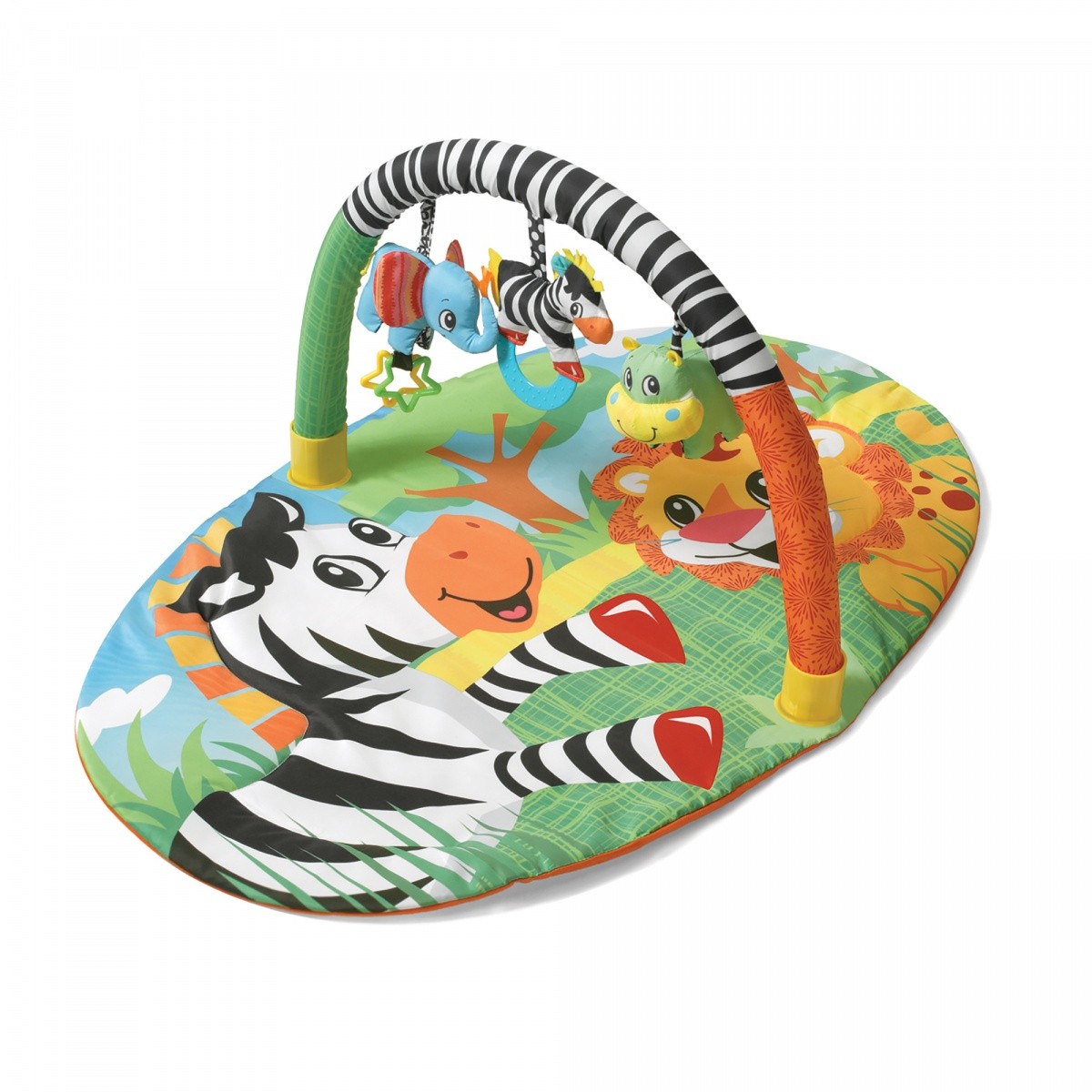 Na tej macie-dżungli żyją trzej przyjaciele klekoczący słonik, gryzaczek zebra i dzwoniący hipopotam. Wisząc wesoło na pałąku zachęcają dziecko do zabawy i odkrywania świata wraz z nimi.