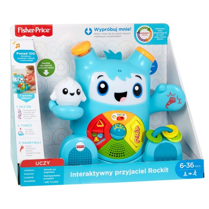 Interaktywna zabawka muzyczna dla dzieci Rockit uczy dziecko alfabetu, liczb, słówek po angielsku i nie tylko a wszystko to podczas tańca i radosnej zabawy w towarzystwie wielokolorowych światełek! Rozkołysany Rockit i Glow wprost nie mogą się doczekać wspólnej interaktywnej nauki z Twoim maluchem! Przyjaciele wchodzą w interakcje ze sobą i z Twoim dzieckiem, zabawanie kołysząc się na boki oraz ucząc alfabetu, liczenia, kolorów, kształtów i nie tylko w rytmie ciekawych piosenek. Twoje dziecko będzie z radością odkrywać różne sposoby na zabawę i obserwować interakcje tych dwóch przyjaciół przy akompaniamencie kolorowych światełek i radosnych ruchów. Przybij piątkę! Rockit może nawet nagrać Twoje słowa i powtórzyć je jednym z 3 śmiesznych głosów! A ponadto dzięki technologii Poziomy nauki treści edukacyjne zmieniają się wraz z wiekiem dziecka!