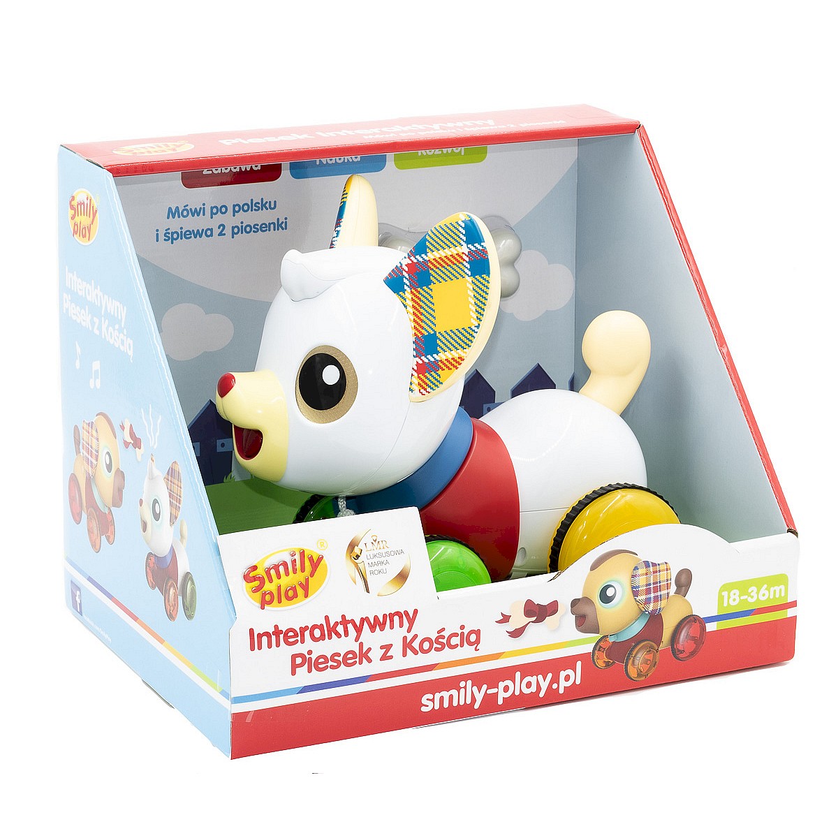 Interaktywny Piesek z Kością mówi po polsku i śpiewa 2 piosenki, w tym jedną po angielsku. Ma świecące oczy o zmieniającym się kolorze i sznureczek do ciągnięcia.