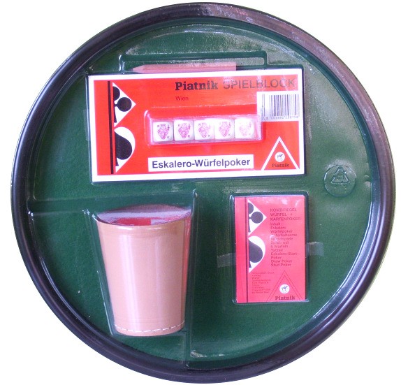 Strona główna Gry/Puzzle gry KOŚCI POKEROWE, TACKA, KUBEK SKÓRZANY Cena Netto: 56,09 zł. error_outline Produkt chwilowo niedostępny. Opis Zestaw firmy PIATNIK zwiera kości pokerowe, tackę, skórzany kubek i bloczek do zapisu wyników.