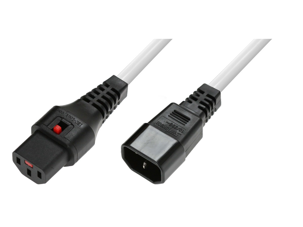 Przewód o długości 3m w kolorze białym, posiadający złącze proste IEC C14 oraz proste IEC C13, wyposażony w system blokujący IEC LOCK. Zastosowanie takiego przewodu zabezpiecza każde podłączone do niego urządzenie przed nagłą utratą zasilania w wyniku przypadkowego wypięcia, wibracji lub innych działań. Niewątpliwą zaletą systemu IEC LOCK jest jego uniwersalność, gdyż przewody lub wtyki z blokadą mogą być stosowane ze wszystkimi standardowymi gniazdami IEC. Zblokowanie następuje automatycznie po wpięciu przewodu, zaś jego odłączenie możliwe jest dopiero po zwolnieniu przycisku blokady. Przewód posiada uziemienie, co dodatkowo gwarantuje bezpieczeństwo podłączonych urządzeń.
