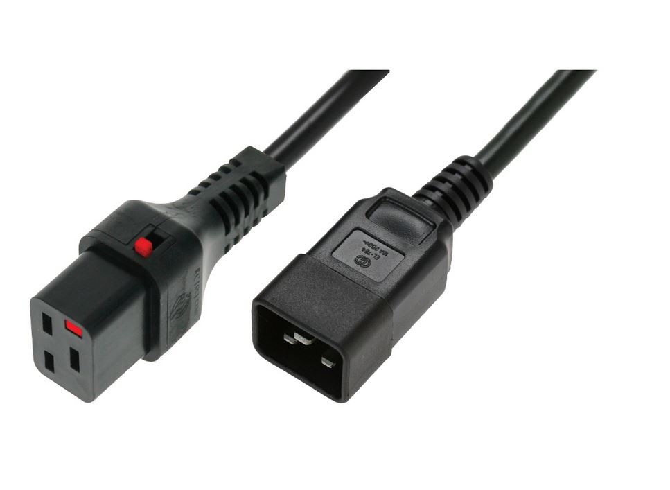 Przewód o długości 1m w kolorze czarnym, posiadający złącze proste IEC C20 oraz proste IEC C19, wyposażony w system blokujący IEC LOCK. Zastosowanie takiego przewodu zabezpiecza każde podłączone do niego urządzenie przed nagłą utratą zasilania w wyniku przypadkowego wypięcia, wibracji lub innych działań. Niewątpliwą zaletą systemu IEC LOCK jest jego uniwersalność, gdyż przewody lub wtyki z blokadą mogą być stosowane ze wszystkimi standardowymi gniazdami IEC. Zblokowanie następuje automatycznie po wpięciu przewodu, zaś jego odłączenie możliwe jest dopiero po zwolnieniu przycisku blokady. Przewód posiada uziemienie, co dodatkowo gwarantuje bezpieczeństwo podłączonych urządzeń.