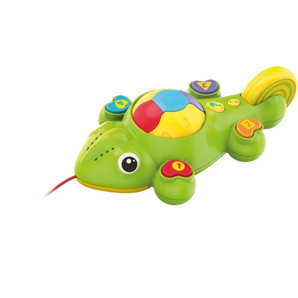 Kameleonem można bawić się w różny sposób. Można naciskać, przyciski funkcyjne, uczyć się kolorów i kształtów, odpowiadać na pytania, słuchać melodyjek....Można też chwycić za sznurek i iść z Leonem na spacer.