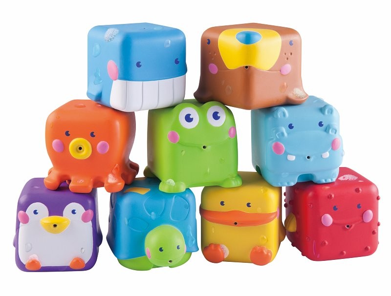 Wystarczy ściśniętą zabawkę zanużyć pod wodę i puścić, aby nabrać wody do środka, a następnie ścisnąć zabawkę aby poleciał strumień wody. Klocki wykonana z gumy. Wiek: 6M+