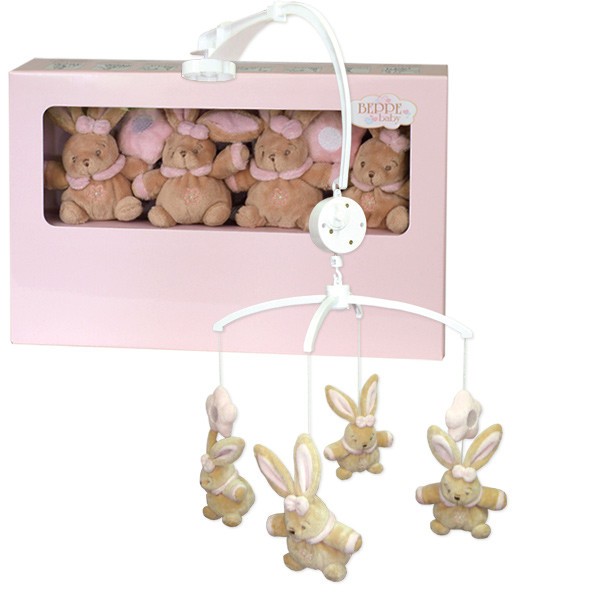Karuzela z pozytywką z 4 podwieszanymi króliczkami w kolorze jasnobeżowym z delikatnymi błękitnymi wstawkami. Statyw wykonany z solidnego białego plastiku wraz z zakręcanym mocowaniem do ramy łóżeczka dziecka.