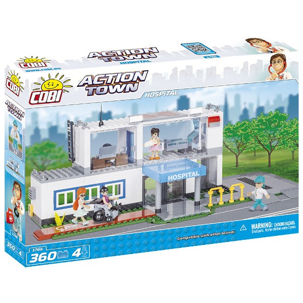 Zestaw zawiera 360 klocków, z których można zbudować dwupoziomowy szpital z lądowiskiem dla helikopterów. Na parterze znajduje się izba przyjęć i sala operacyjna z regulowanym stołem operacyjnym i lampami świecącymi w ciemności. Na I piętrze znajduje się sala dla pacjenta, pokój lekarza. Zestaw zawiera wiele ciekawych akcesoriów jak laptopy, wózek inwalidzki, mebelki. Są 4 figurki: lekarz, pielęgniarka, dżokejka i młoda mama z maleństwem.