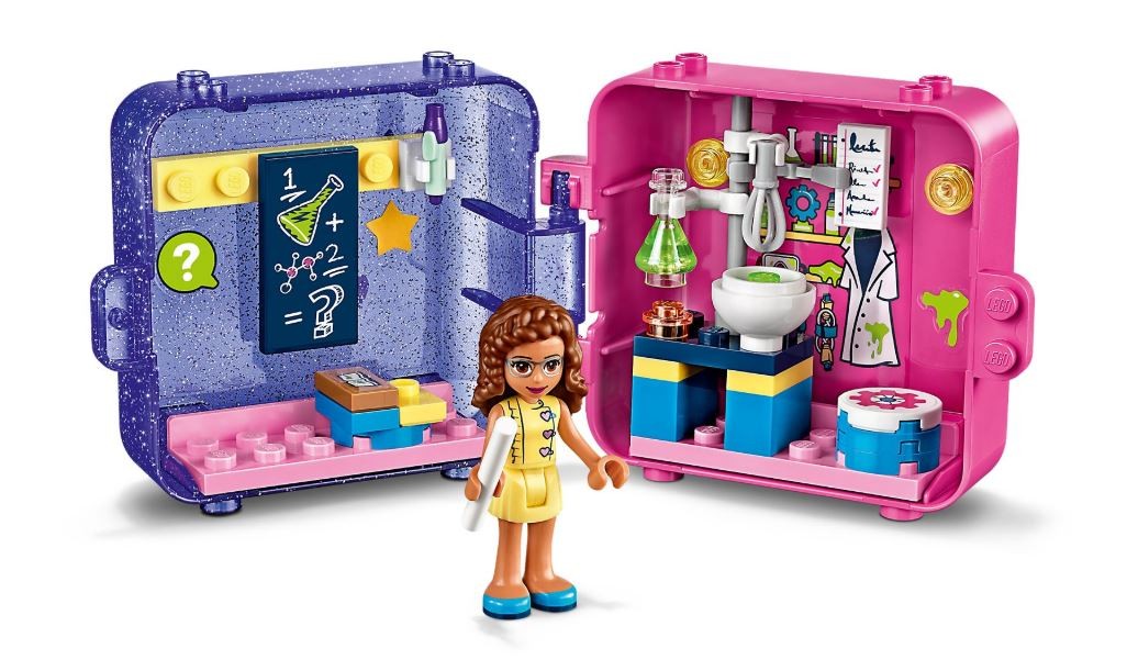 - Kostka do zabawy Olivii (41402) jest niewielka, ale oferuje dużo możliwości zabawy. W środku znajduje się jedna minilaleczka naukowczyni, figurka zwierzątka, sala szkolna i laboratorium LEGO z zabawkową oślizgłą substancją, a także mnóstwo akcesoriów dla minilaleczki i arkusz naklejek.