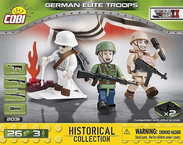 - Dwie figurki posiadają nowe nadruki długich butów z cholewami. Figurka została wyposażona w rzadki biały hełm, narty oraz kijki. Po raz pierwszy w ofercie COBI pojawił się gumowy pas nośny na broń długą oraz karabin snajperski z lunetą Mauser Kar 98K.
